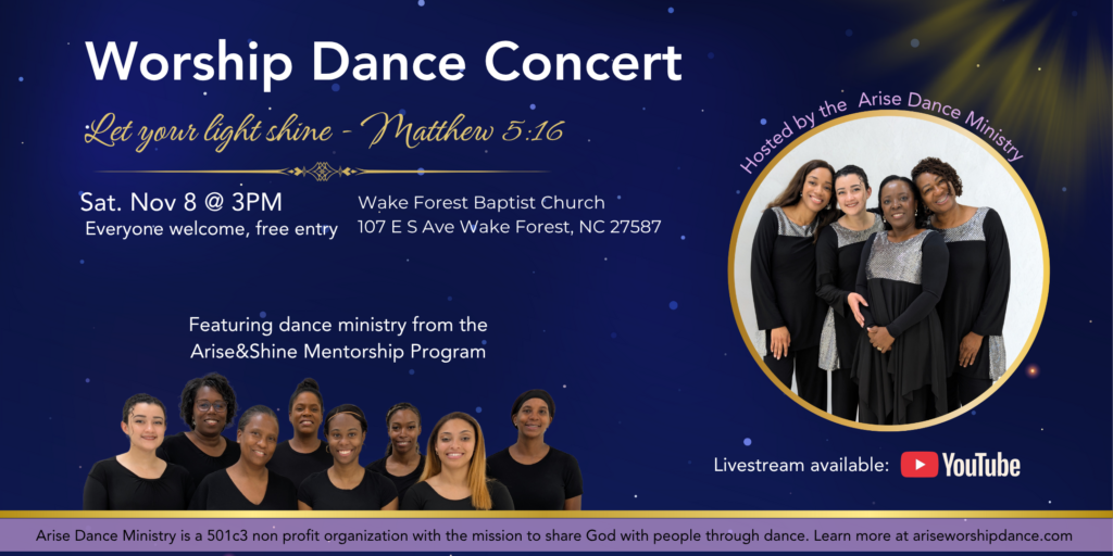 All are invited to a Worship Dance Concert hosted by the Arise Dance Ministry led by Christina Clark on Saturday Nov 8, 2025 at the Wake Forest Baptist Church located at 107 E. S Ave at 3PM